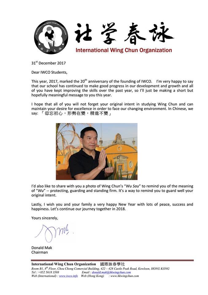 Я надеюсь, что все вы не забудете первоначальное намерение, с которым вы начали изучать Вин Чун и будете поддерживать желание стремиться к совершенствованию для того, чтобы могли встретиться лицом к лицы с изменяющейся окружающей действительностью. Китайская пословица гласит: "